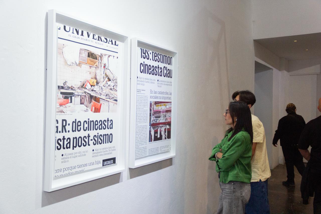 Bajo la curaduría de Michel Blancsubé, la muestra de Villegas presenta trípticos y dípticos pictóricos que asocian imágenes de edificios derrumbados recuperadas en redes sociales y transcripciones de extractos de las entrevistas con sobrevivientes realizadas por el artista.