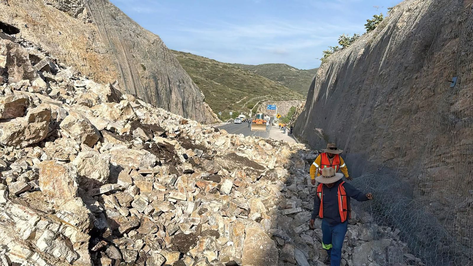 La Comisión Estatal de Infraestructura informó que personal de la dependencia trabaja en el retiro del material que cayó nuevamente en el km 33+900 de la Carretera Estatal 100, a la altura de Bernal, Ezequiel Montes.