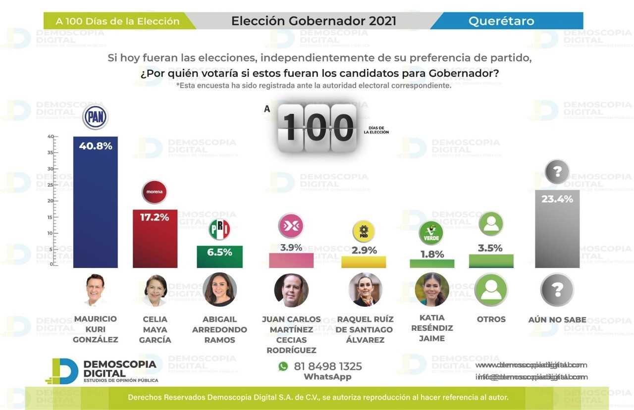 A 94 días de las elecciones y aún sin iniciar formalmente las campañas políticas, se ha intensificado la guerra de encuestas sobre la intención del voto de los queretanos, especialmente para la gubernatura del Estado. En todas lidera el candidato del PAN Mauricio Kuri González con mayor o menor diferencia, seguido por la magistrada en retiro Celia Maya García, la abanderada de Morena.