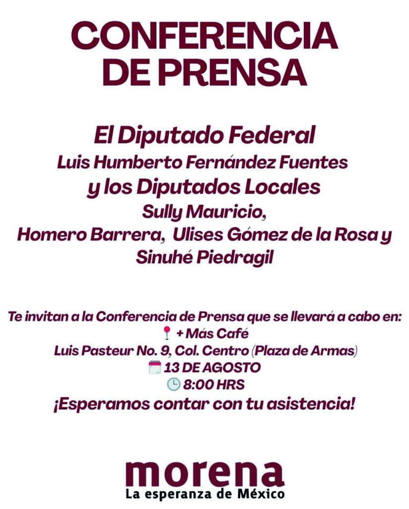 Para hoy a las ocho de la mañana anuncian conferencia de prensa los diputados de Morena Luis Humberto Fernández, Sully Mauricio, Homero Barrera, Ulises Gómez de la Rosa y Sinuhé Pedragil en el Máscafé… del Portal Quemado.
