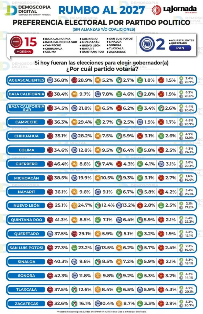 Quince de las 17 gubernaturas en disputa en el 2027 serían para Morena según la última encuesta de Demoscopia Digital y La Jornada, con excepción de Aguascalientes y Querétaro, dos de los últimos reductos del PAN.