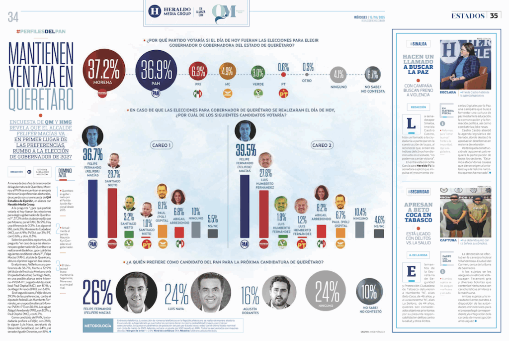 Ayer se publicó una encuesta en El Heraldo (de México) según la cual el alcalde panista Felifer Macías Olvera se mantiene en primer lugar en las preferencias para la elección de gobernador de Querétaro, superando a los morenistas Santiago Nieto Castillo y Luis Humberto Fernández en careos, pero (ojo, mucho ojo) registra empate técnico entre PAN y Morena.