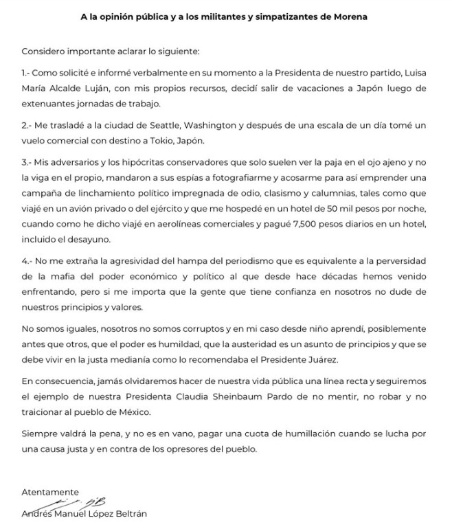 En un pronunciamiento emitido en redes sociales, tras 15 días ausente de las actividades públicas del partido, López Beltrán informó que luego de las elecciones en Veracruz y Durango, solicitó permiso a la Presidenta del cuadro guinda, Luisa Alcalde, para viajar.