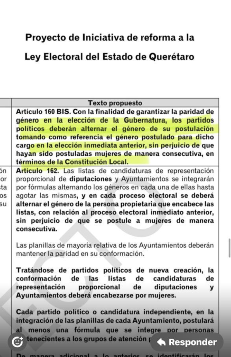 De acuerdo con el proyecto en caso de aprobarse (con mayoría simple) Acción Nacional, que lanzó en 2021 a Mauricio Kuri, debería de optar por candidata, mientras que Morena podría hacerlo también, “sin perjuicio de que hayan sido postuladas mujeres de manera consecutiva”.