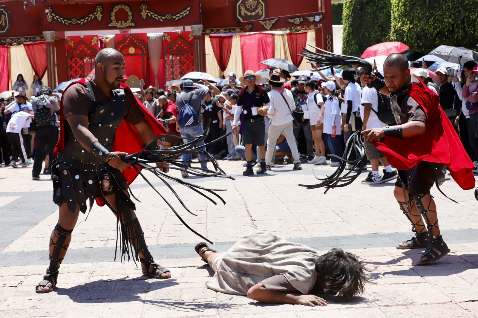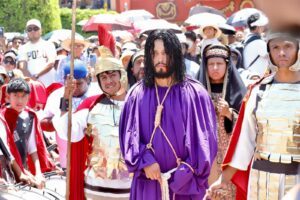 En la representación, el actor carga una cruz sobre su hombro derecho, mientras es escoltado por elementos caracterizados como soldados romanos, quienes simulan azotes durante el trayecto.