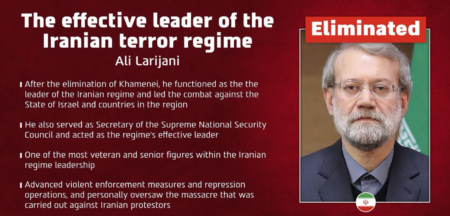 El Ministerio de Defensa de Israel aseguró que mató al secretario del Consejo Supremo de Seguridad Nacional de Irán, Ali Lariyani, en los bombardeos de anoche contra “infraestructuras del régimen” iraní.