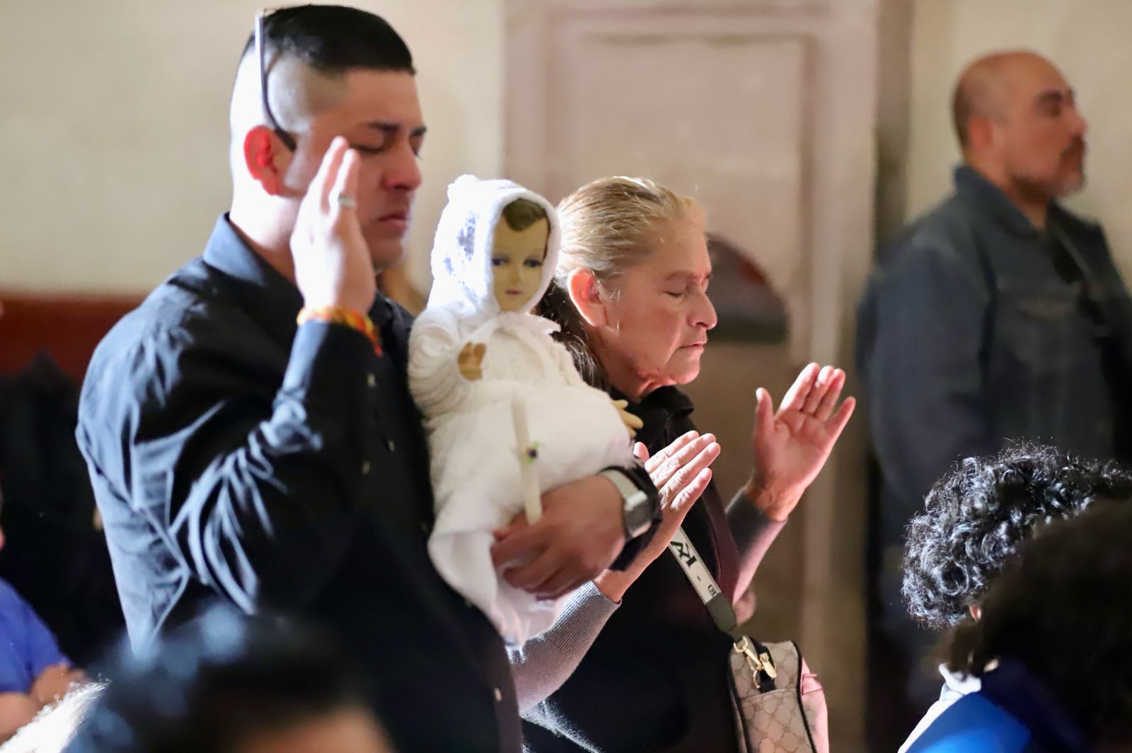 Por las calles del Centro caminan padrinos y madrinas con los brazos ocupados y el gesto serio, concentrado. Un hombre mayor cruza bajo el sol con sombrero puesto. Lleva al Niño Dios recostado en una canasta pequeña y poco profunda. El niño va envuelto en una manta blanca; las manos levantadas, los dedos apuntando al cielo, los ojitos bien abiertos. Más adelante, una mujer —madrina también— carga a otro Niño Dios cubierto con gorrito blanco, calcetas y ropa abrigadora, como si el invierno pudiera alcanzarlo de pronto.