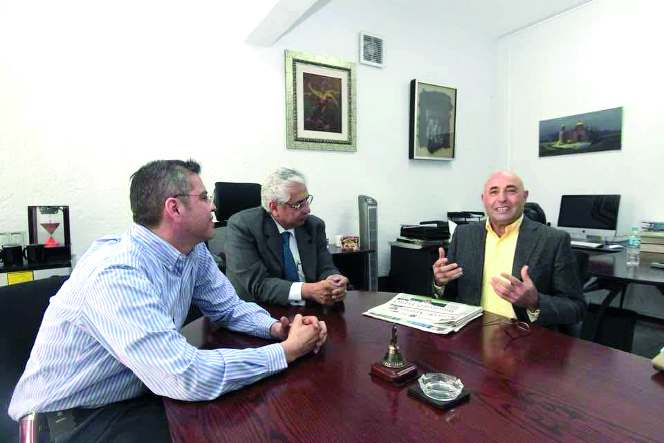 EL MISMÍSIMO Carmelo Rodero, creador de uno de los mejores vinos de Ribera del Duero, en una de sus visitas a las antiguas oficinas del periódico Plaza de Armas con El Armero y este columnista.