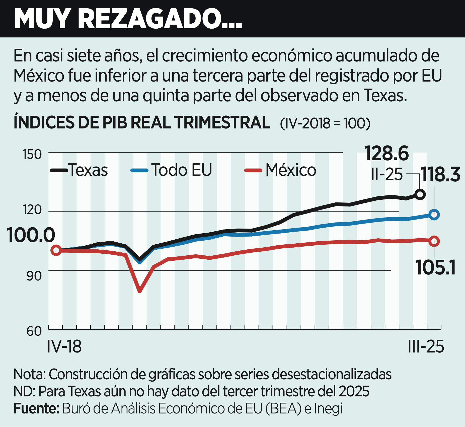 La economía mexicana bajo la 4T ha tenido un desempeño muy malo: entre el 2018 y el 2024, apenas creció 32% de lo que lo hizo EU e, increíblemente, solo 20% de lo que en ese periodo creció el estado de Texas.
