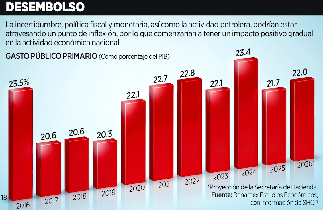 “No obstante, ese impacto se vería más que compensado con la expansión del gasto el siguiente año (proyectamos que el gasto que excluye el costo financiero pase de 21.7 por ciento del PIB este año a 22 por ciento en 2026), en particular por los mayores egresos asociados a programas sociales y en inversión pública, la cual ha caído de forma significativa este año”, indicaron los economistas en una Nota Especial publicada este 23 de octubre.