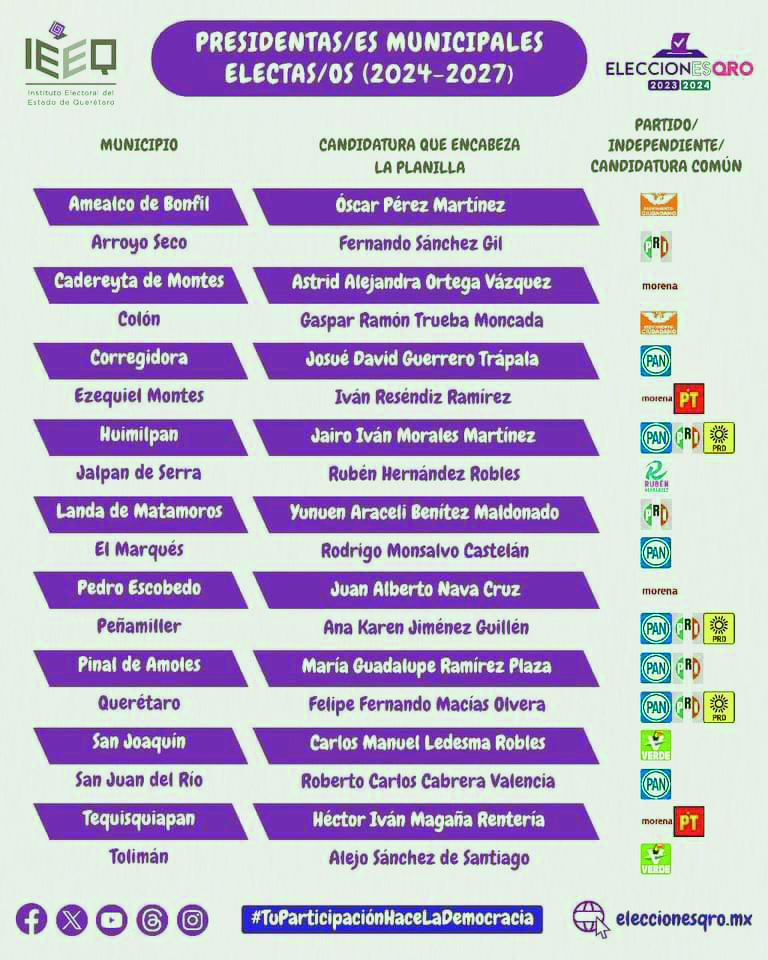 En el caso de Morena su bombo 1 incluye Cadereyta, Tequisquiapan, Ezequiel Montes, Queretaro, San Juan del Río y Pedro Escobedo. Para la capital tienen a la diputada Andrea Tovar y a la senadora Beatriz Robles y en San Juan del Río, en donde Edgar Inzunza Ballesterros resulta el más competitivo, a Rosy Ríos de Sinecio.