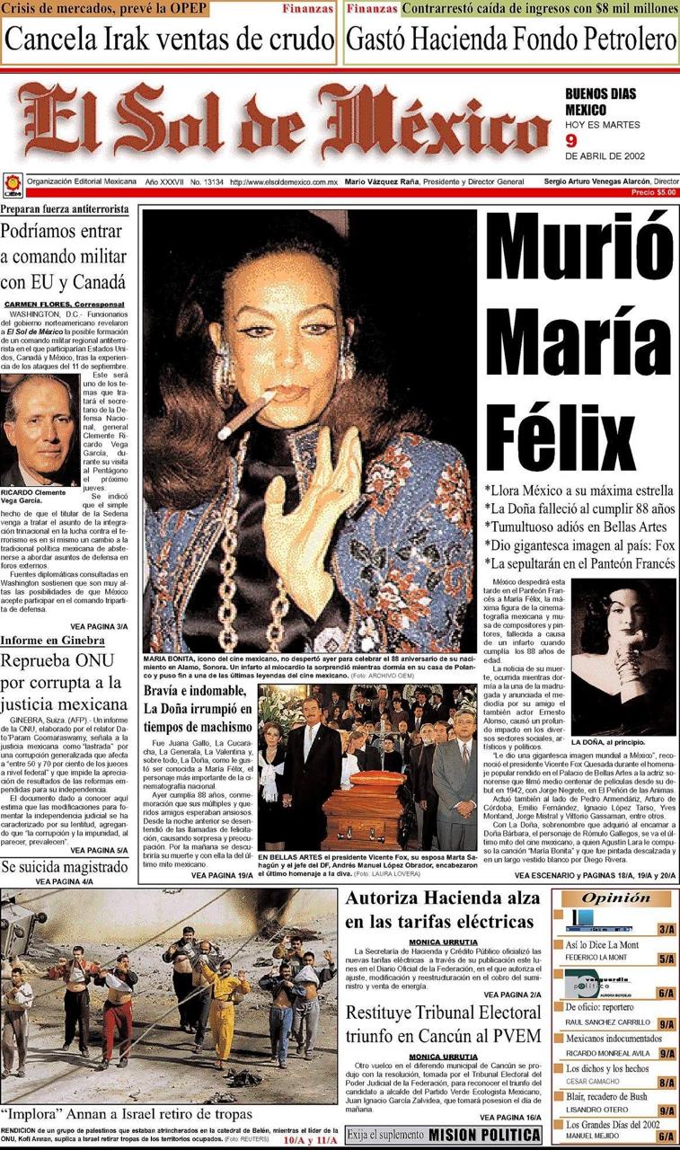 Junto a su ataúd, en el homenaje de Bellas Artes, montaron guardia el entonces presidente Vicente Fox y el jefe del Distrito Federal, Andrés Manuel López Obrador, los irreconciliables, como lo publicaron al día siguiente las primeras planas de todos los diarios nacionales, incluido El Sol de México, dirigido por este columnista que tuvo el privilegio de conocer y hablar con La Doña, el mayor mito del cine mexicano, pero un mito que comía, sentía y se enojaba, como aquella mañana en la que llamó al periódico para protestar por una foto porque ella no era esa calaca. Era -y sí- la mujer de la que se enamoraron Jorge Negrete, Diego Rivera, Agustín Lara y hasta un Papa.