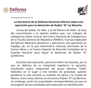 Mediante un comunicado de prensa, la Secretaría de la Defensa Nacional, dio a conocer que al ejecutar una operación militar en Tapalpa, Jalisco, fueron recibidos a balazos por integrantes del Cartel Jalisco Nueva Generación. Se supo que al repeler la agresión, cuatro sicarios de la organización criminal fueron abatidos, mientras que otros tres resultaron heridos de gravedad y “Perdieron la vida durante su traslado vía aérea a la ciudad de México; entre estos últimos se encuentra Rubén “N”, alias Mencho.