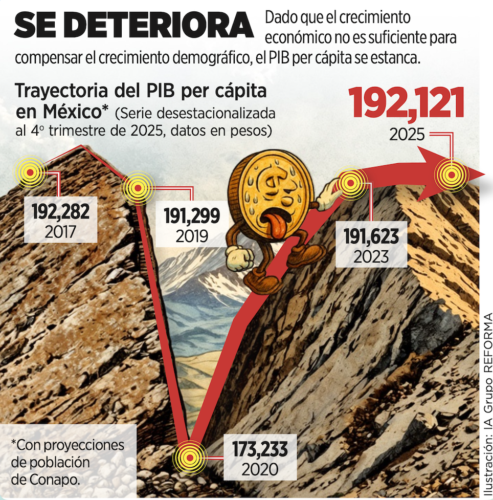 El Producto Interno Bruto (PIB) per cápita en México, es decir, el ingreso promedio por habitante en el País, sufrió un estancamiento en 2025 por el bajo crecimiento económico y quedó en niveles similares a los de 2017, lo que provoca un deterioro en el poder adquisitivo de las familias.