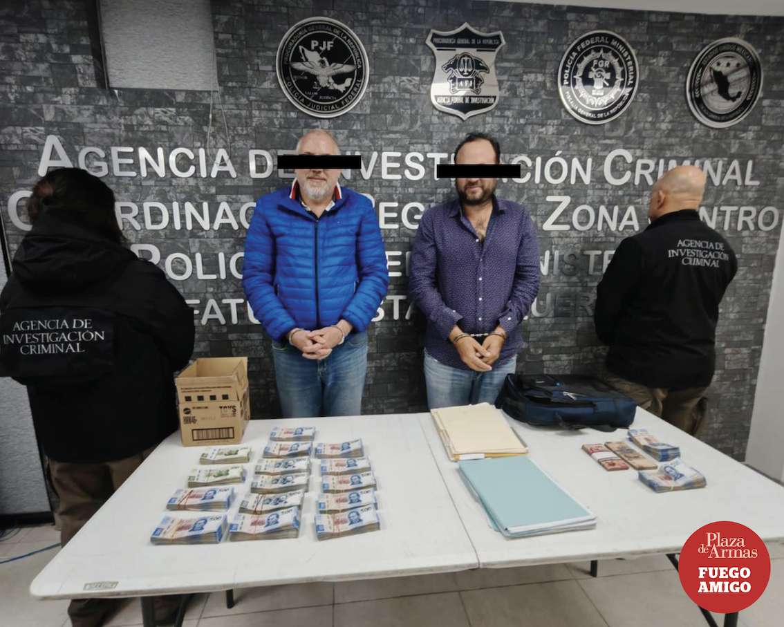 NO ERA AGUINALDO. Elementos de la Policía Federal Ministerial detuvieron este miércoles a dos individuos. Luis “N” y Pedro “N”, que circulaban cerca de la Central Camionera a bordo de un BMW con placas de Querétaro. Se les encontró y aseguró un millón de pesos en efectivo, cuyo origen no pudieron acreditar, por lo cual se les imputa el delito de posesión de recursos de procedencia ilícita. ¡Pero mira cómo mueven!