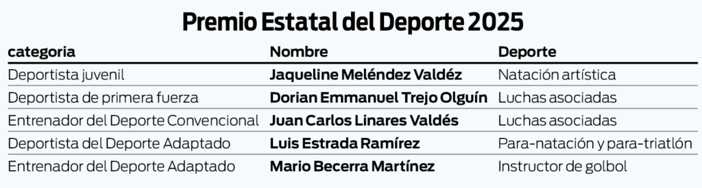 En la categoría Deportista del Deporte Adaptado, el ganador fue Luis Estrada Ramírez, quien obtuvo ocho medallas de oro en para-natación y una en para-triatlón durante la Paralimpiada Nacional CONADE 2025, además de formar parte de la selección nacional rumbo a los Juegos Parapanamericanos de Chile.