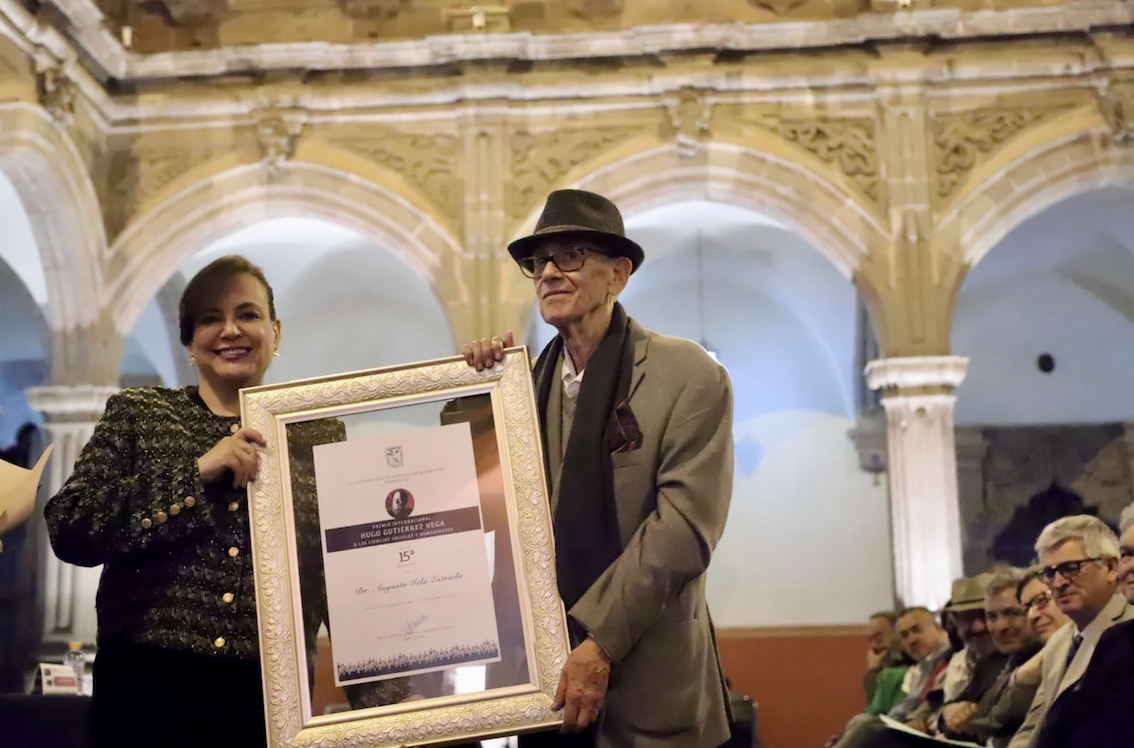El galardón Hugo Gutiérrez Vega fue entregado a Augusto Isla Estrada, filósofo, escritor, abogado y colaborador de Plaza de Armas, El Periódico de Querétaro. En voz del director de la Facultad de Derecho, Edgar Pérez González, se dio lectura a una amplia semblanza que destacó más de cinco décadas de aportaciones en sociología, filosofía, docencia, archivo histórico, crítica cultural y periodismo.