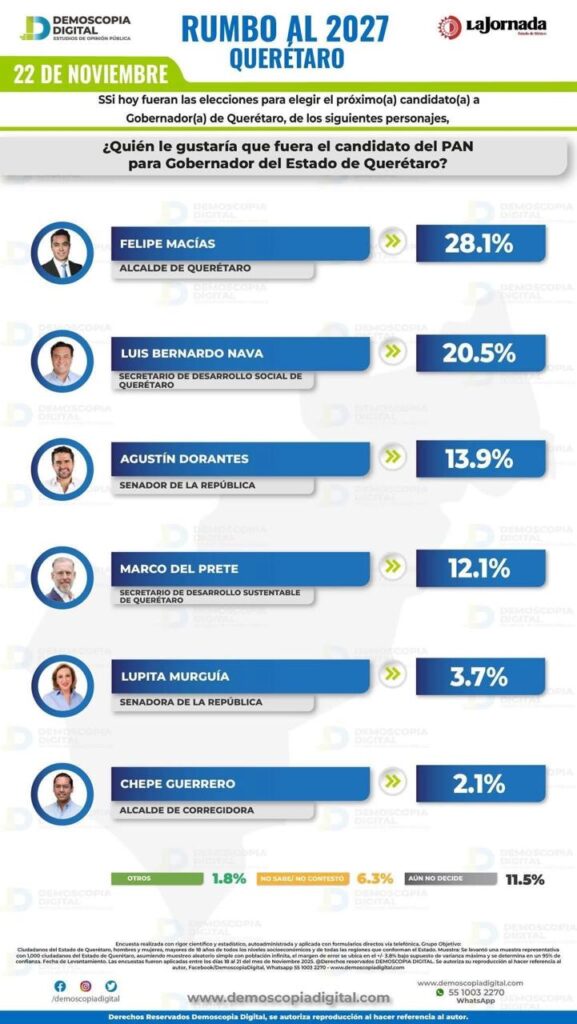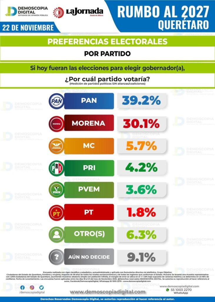 Apoco más de un año y medio de los comicios el Partido Acción Nacional se mantiene en las preferencias electorales en Querétaro con nueve puntos de ventaja sobre Morena: 39.2 por ciento contra 30.1, de acuerdo con la encuesta publicada este sábado 22 de noviembre por Demoscopia Digital/La Jornada, que coloca en tercer lugar a Movimiento Ciudadano con 5.7.