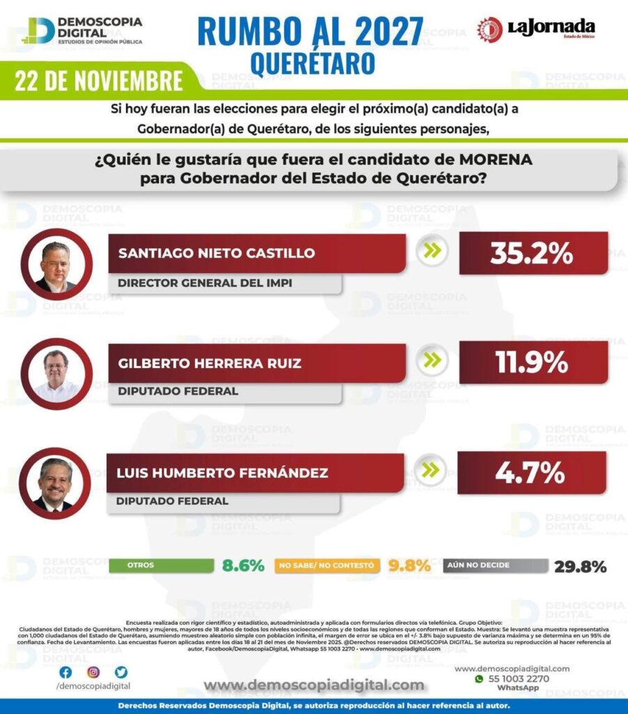 Por Morena lidera Santiago Nieto con 35.2, Gilberto Herrera 11,9 y Luis Humberto Fernández 4.7%.