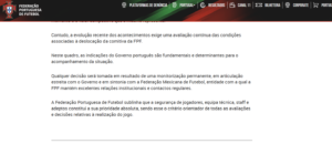 “La Federación Portuguesa de Fútbol subraya que la seguridad de los jugadores, del cuerpo técnico, del personal y de la afición es su absoluta prioridad, siendo este el criterio rector de todas las evaluaciones y decisiones relativas a la celebración del partido”.