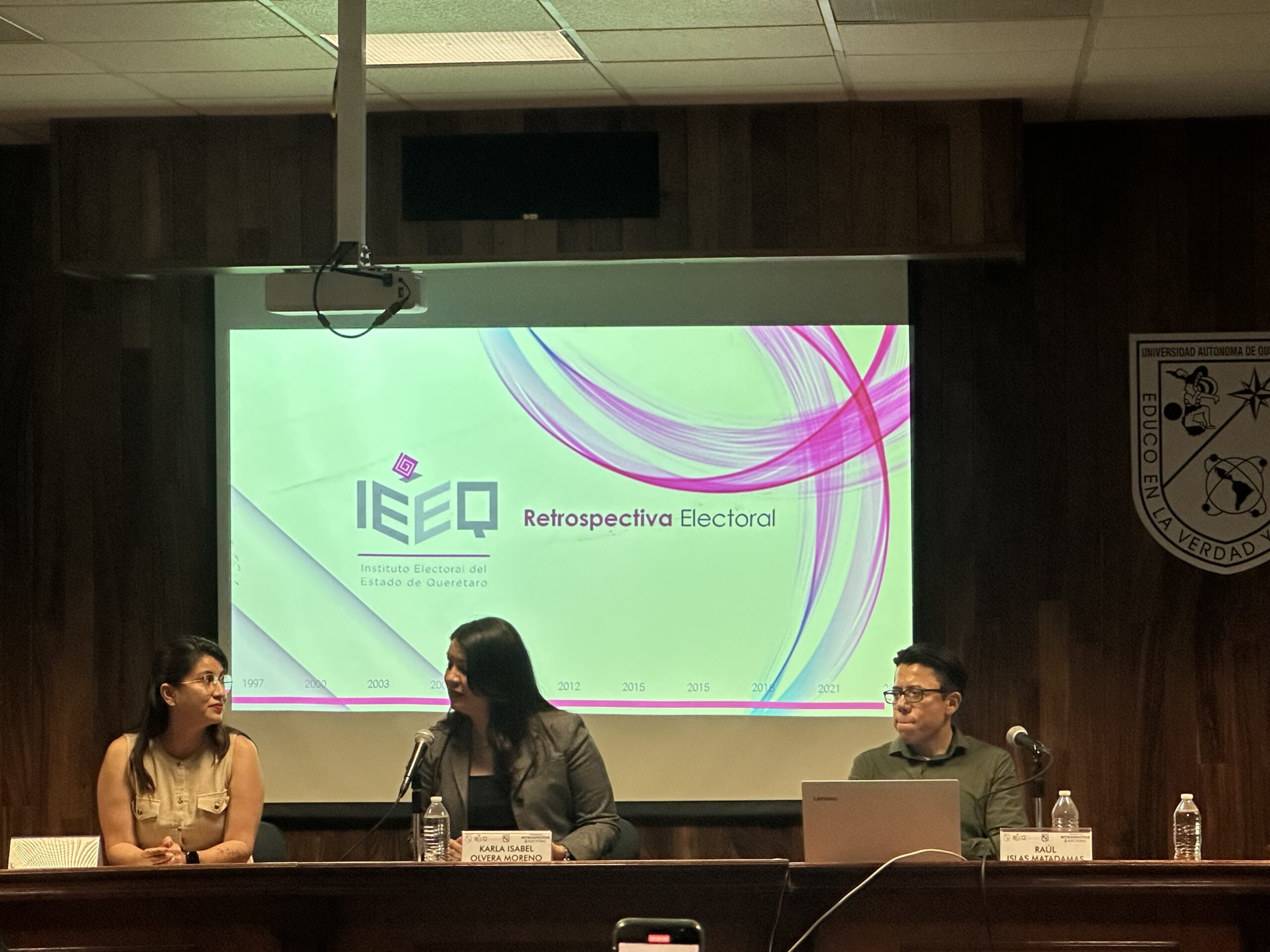 El Instituto Electoral del Estado de Querétaro (IEEQ) presentó su Retrospectiva Electoral plasmada en los libros ‘Informe y Estadística. Proceso Electoral Local 2023-2024’ y ‘Memoria Gráfica del Proceso Electoral 2023-2024’, en el auditorio de la Facultad de Ciencias Políticas y Sociales de la Universidad Autónoma de Querétaro (UAQ).