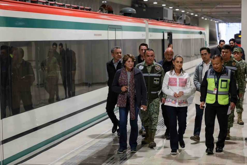 La Presidenta Claudia Sheinbaum abordó el tren blanco con líneas rojas y verdes en la Estación Cueyamil, en Tultitlán; la nueva fecha prometida para entregar la obra es antes de que inicie Mundial.