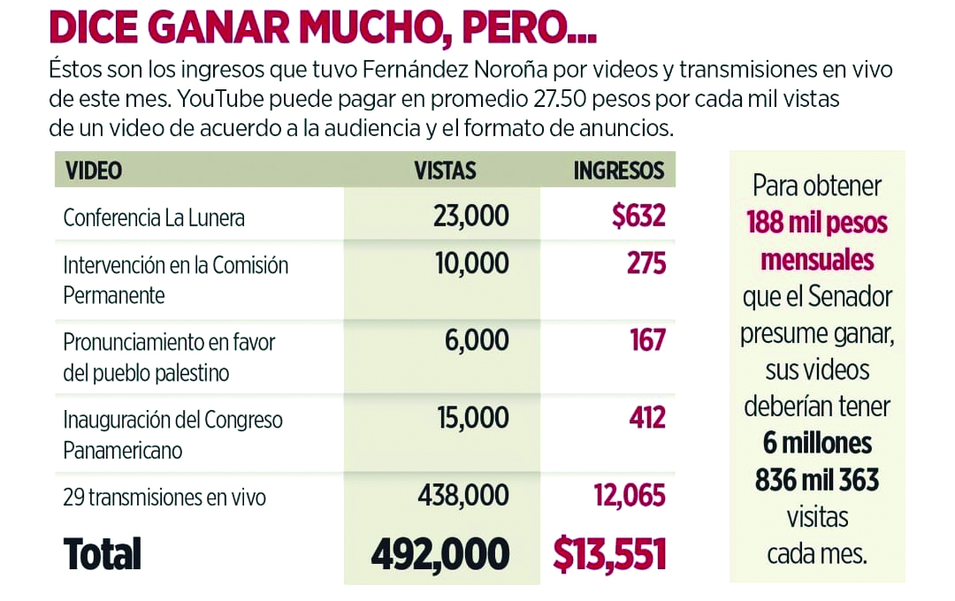Las transmisiones cotidianas del senador Gerardo Fernández Noroña se han convertido en una fuente de ingreso ilegal pues recibe donaciones en efectivo que funcionarios públicos tienen prohibido aceptar.