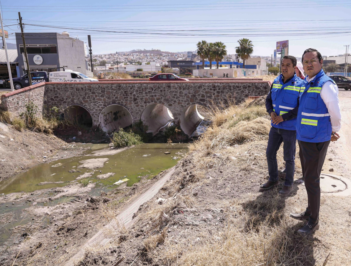 Finalmente, tras el incendio registrado en los tubos del puente de acceso a Los Olvera, se llevó a cabo la limpieza de los conductos pluviales y actualmente se realizan adecuaciones para su conexión con el dren de Tejeda, a fin de mejorar el flujo del agua durante la temporada de lluvias.