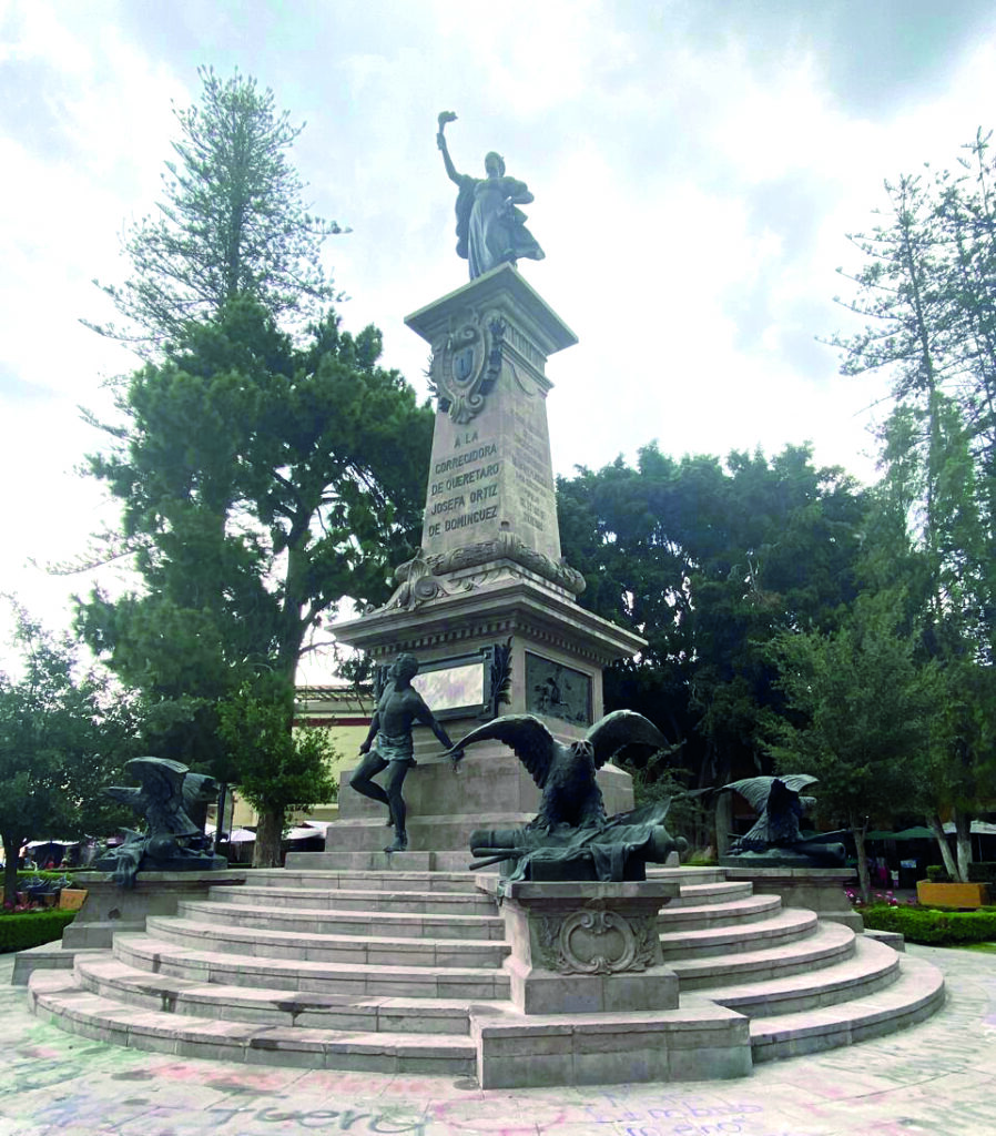 MONUMENTO A LA CORREGIDORA inaugurado en 1910 en el Centro Histórico de Querétaro con motivo del centenario del inicio del movimiento de Independencia. Como puede apreciarse aparece el nombre de Josefa Ortiz de Domínguez.