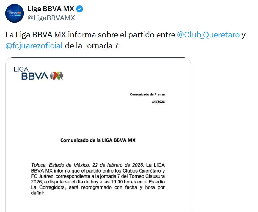 La LigaMx informó en su cuenta X que el partido entre Querétaro y Bravos de Juárez, que se disputaría  este domingo a las 19:00 hrs en el Estadio Corregidora, será reprogramado con fecha y hora por definir.
