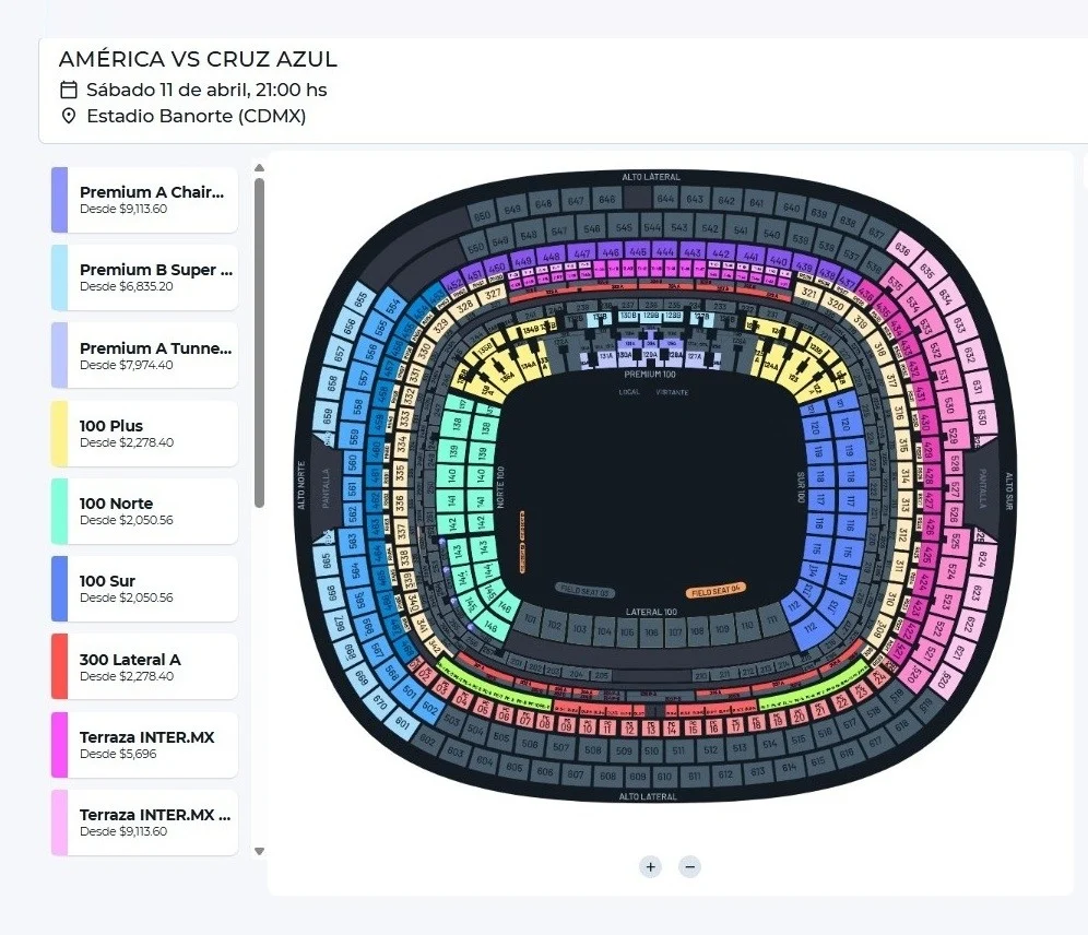 De ahí, la zona 400 Lateral sube a los mil 25 pesos y la sección 300 en Preferente alcanzan los mil 595 pesos y lateral en 2 mil 278.