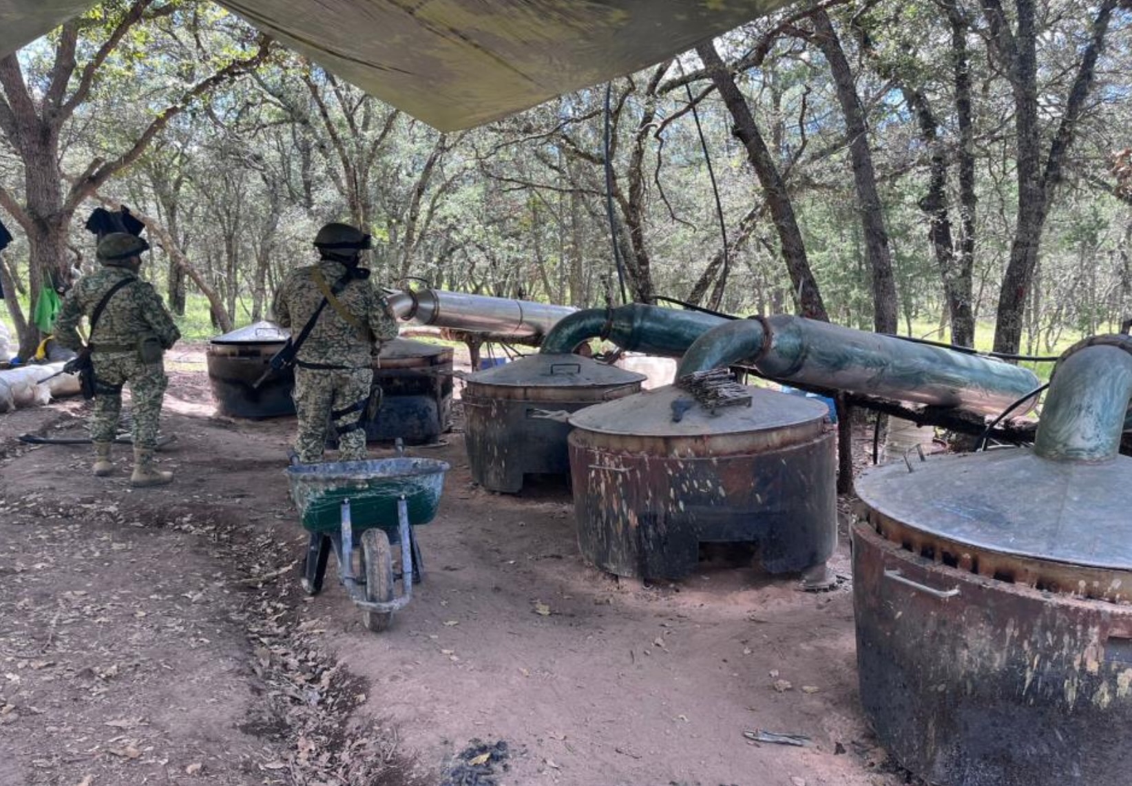 Al cobijo de los árboles y la maleza del sitio, se ubicaron contenedores de plástico con 2 mil litros de precursores químicos, tres contenedores en color rojo con 900 litros de una sustancia química desconocida, 180 litros de hidróxido telmisartán (compuesto que en medicina se aplica para tratar la hipertensión, nefropatías y la insuficiencia cardiaca), 21 bultos llenos de una sustancia química granulada con 220 kilos en total, 5 destiladores metálicos de gran capacidad y otras sustancias químicas.