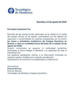 El sótano y el gimnasio del Tec de Monterrey sufrieron inundaciones por las lluvias del viernes y la madrugada del sábado, motivo por el cual las autoridades académicas determinaron la suspensión de clases presenciales del lunes 25 al sábado 30 de agosto.