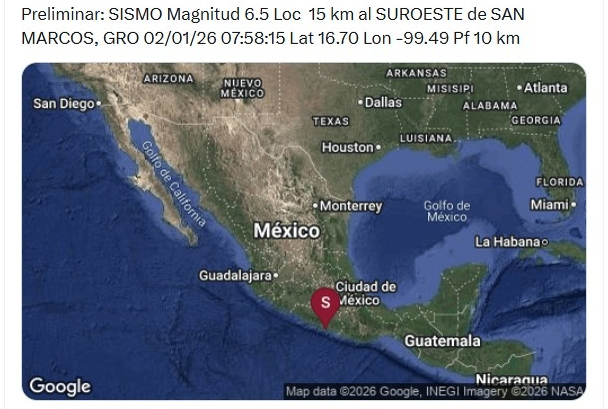 El servicio sismológico nacional da el movimiento de forma preliminar de 6.5 grados y el epicentro de 15 kilómetros al sureste de San Marcos, Guerrero, a las 7:58 de la mañana.