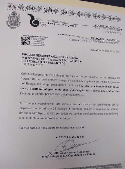 El diputado Mauricio Ruiz Oláes se separará del cargo a partir de hoy, por así convenir a sus intereses, esto de acuerdo a lo informado por el legislador en oficio dirigido al presidente de la Mesa Directiva de la LIX Legislatura del estado de Querétaro.