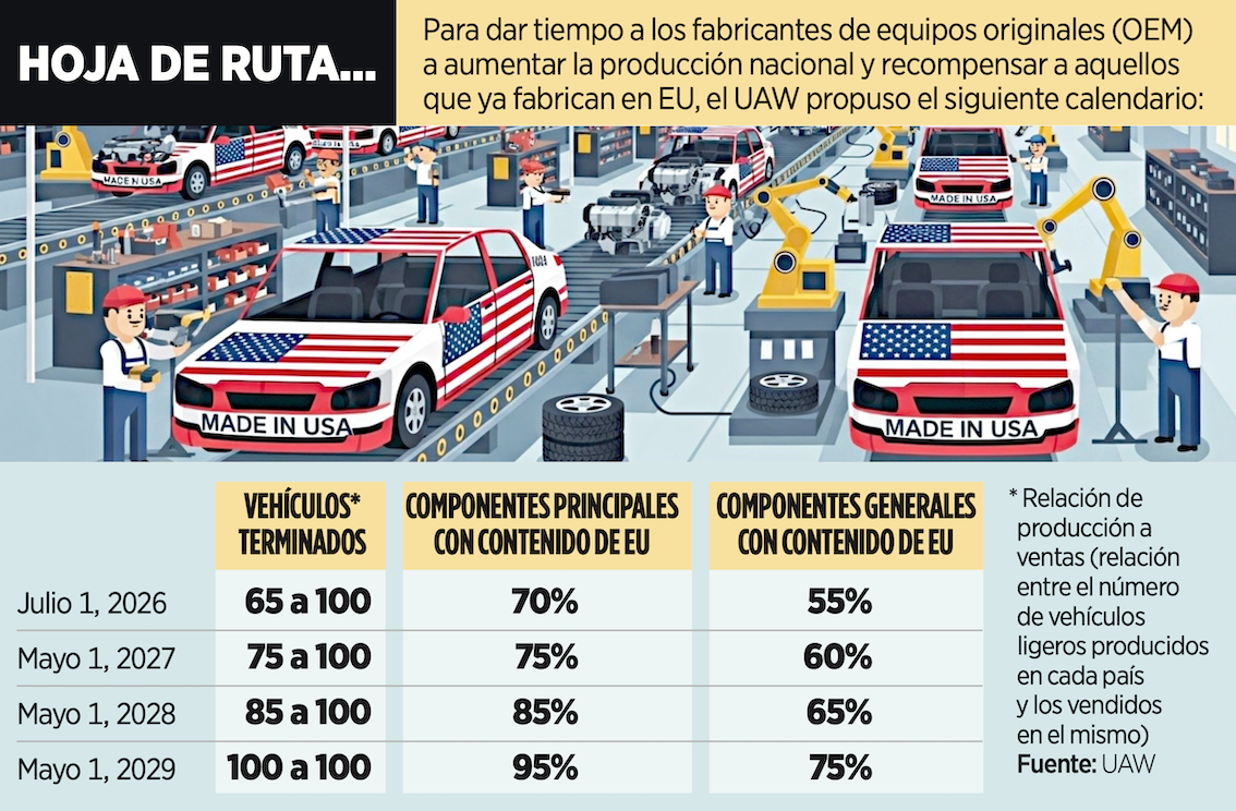 El UAW propone establecer un sistema de cuotas con tres indicadores para garantizar la fabricación en EU de tres categorías de productos: vehículos terminados, componentes principales (motores, transmisiones, ejes con diferenciales, baterías de iones de litio y motores eléctricos) y componentes en general.