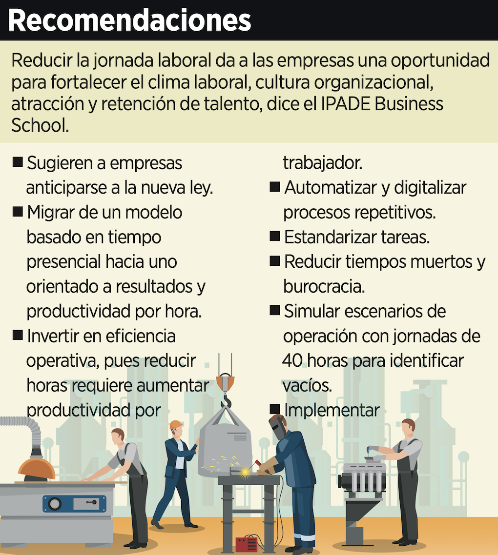 La reducción de la jornada laboral plantea retos en materia de productividad, contratación e incremento en los costos laborales, que pueden ir de entre 10 y 25 por ciento si no se realizan ajustes, advirtió un análisis de IPADE Business School.