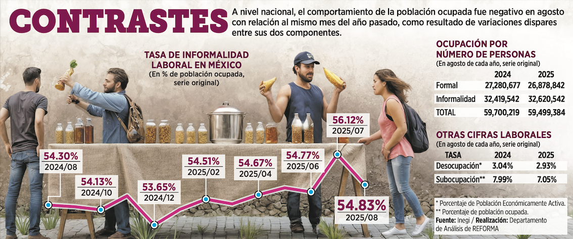 El empleo en todas las modalidades de informalidad aumentó 0.62 por ciento en agosto de 2025, su sexto avance a tasa anual, mientras que la ocupación formal disminuyó 1.47 por ciento, según información del Inegi.