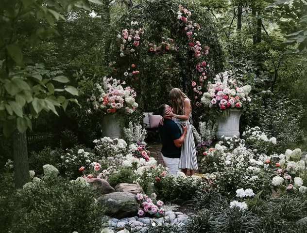 A través de redes sociales, la pareja anunció su compromiso junto a varias imágenes, incluyendo una donde Kelce se ve arrodillado en un jardín y entregándole a Swift un anillo de compromiso diseñado por Kindred Lubeck, de Artifex Fine Jewelry.