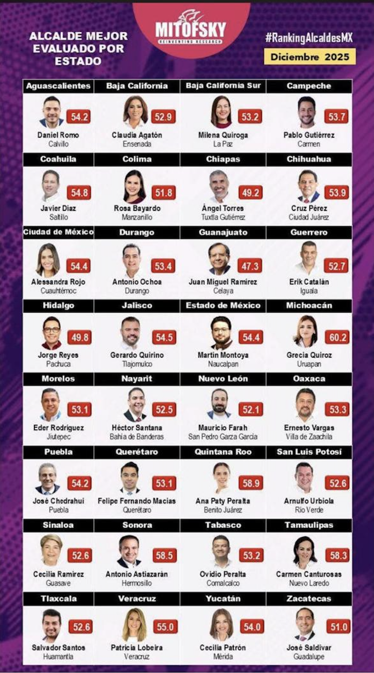 El ranking nacional de alcaldes mejor evaluados, uno por cada estado, da al queretano Felifer Macías (de la capital) el primer lugar con 53.1 por ciento de aprobación.
