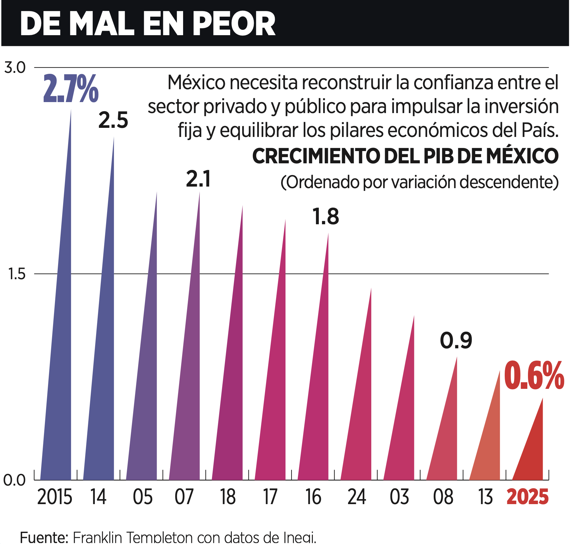 México no cayó en la temida recesión económica en 2025, pero sí registró la peor tasa de crecimiento desde 1994, pues el Producto Interno Bruto tuvo un avance de solo 0.6 por ciento, en términos reales, resaltó Franklin Templeton.