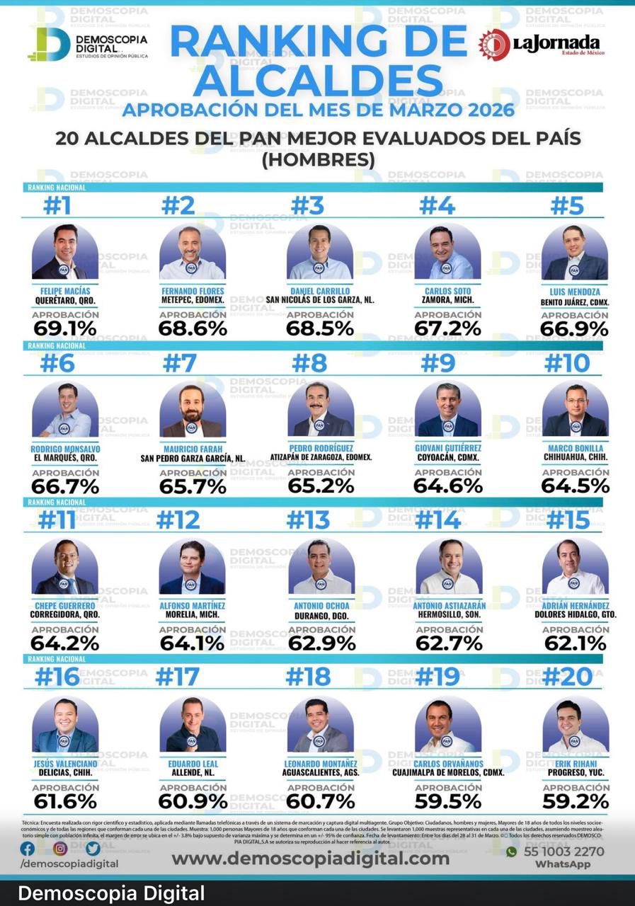 En la medición de marzo  sobre los 20 alcaldes panistas mejor evaluados del país, aparecen tres queretanos: Felifer Macías en primer lugar con 69.1 de aprobación, Rodrigo Monsalvo en el sexto con 66.7 y Chepe Guerrero con 64.2 por ciento, respectivamente.