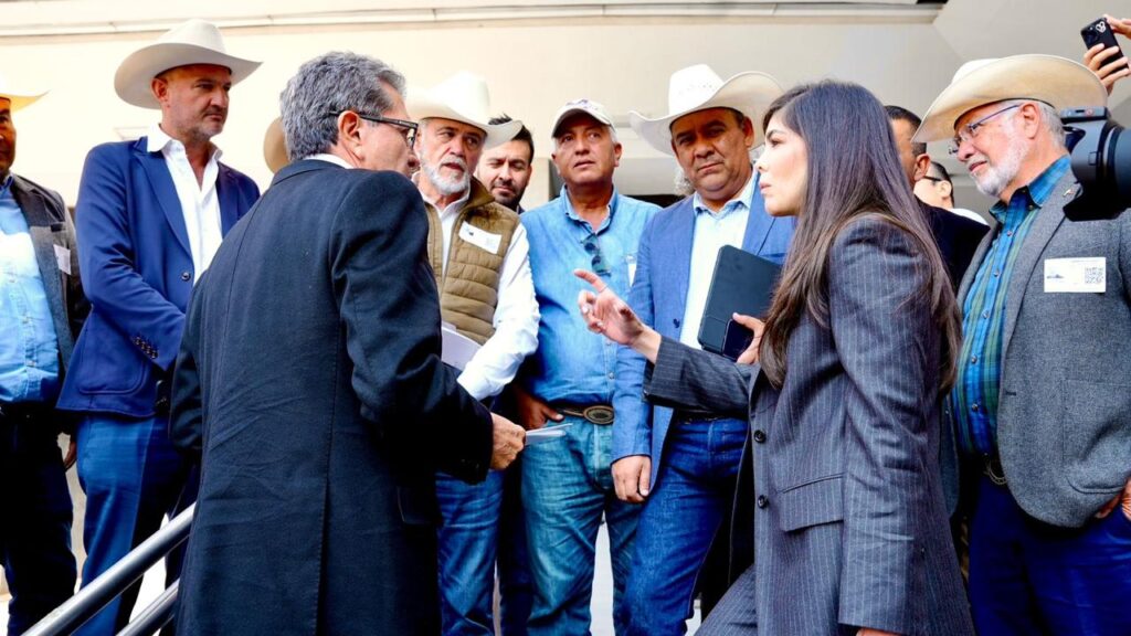 Katia Reséndiz, presidenta del Consejo Consultivo del Agua del Estado de Querétaro acudió ayer al Palacio Legislativo acompañada de productores y líderes del sector primario para hablar con el jefe de la mayoría de los diputados, Ricardo Monreal, sobre la nueva Ley General de Aguas. Ahí estuvieron el secretario de SEDEA, Rosendo Anaya y el presidente de la Unión Ganadera Regional, Romualdo Moreno.