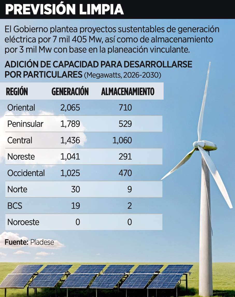 Además, el Programa Vinculante de Instalación y Retiro de Centrales Eléctricas considera que, de 2026 a 2030, la iniciativa privada desarrollará proyectos de almacenamiento con baterías por 3 mil 71 MW, señala el Pladese.