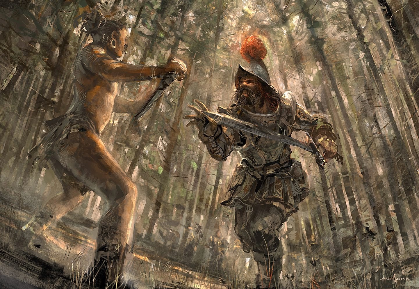 ¡Los hombres de las grandes zancadas se dejan ir a toda la fuerza posible! los jugadores del rito del sacrificante están en pose de batalla inmóviles, esperando el choque…