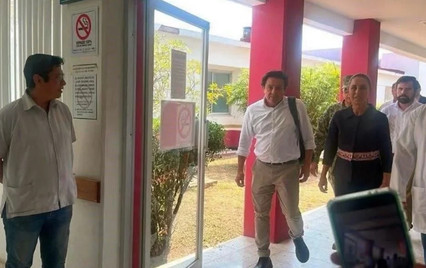 A su llegada al ISSSTE de Tehuantepec, la Presidenta iba acompañada por el Almirante Raymundo Morales, Secretario de Marina, dependencia responsable de la operación del ferrocarril del Istmo; así como por el director del IMSS Bienestar, Alejandro Svarch; y el subsecretario de Derechos Humanos, Félix Arturo Medina.