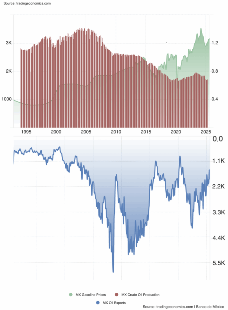 México invirtió lo equivalente de entre 60-100 miles de millones de dólares en Pemex. Aun siendo la petrolera más endeudada del mundo, sigue produciendo pérdidas. La producción de petróleo y las exportaciones están en mínimos históricos. La falta de productividad y la obsesión con refinar a nivel nacional, bajo planes incoherentes e irrealistas, siguen destruyendo la base económica del país.
