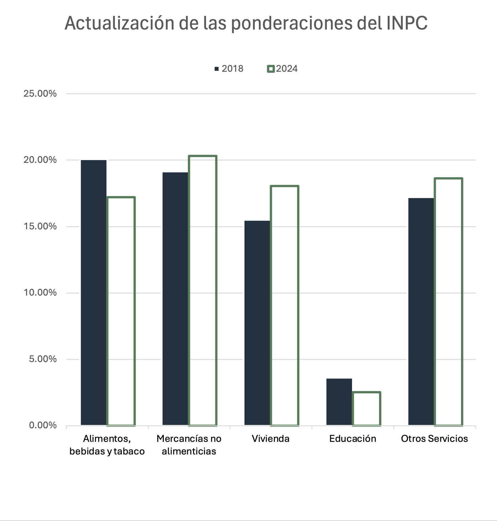 Y, como complemento quirúrgico, llegan los ajustes de ponderaciones; alimentos, bebidas y tabaco, reducen peso relativo, vivienda y servicios —menos volátiles— lo incrementan.